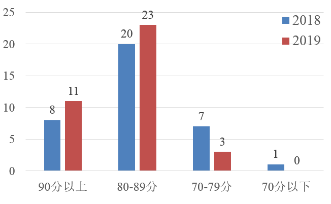 (一)政府采購信息公開整體水平明顯提升。各地區(qū)高度重視政府采購信息發(fā)布平臺建設(shè),普遍加強了對采購項目信息發(fā)布的監(jiān)管力度,其中,北京、福建、廣東、天津等地區(qū)政府采購信息公開工作一直穩(wěn)定在較高水平。從得分分布看(圖1),高分段地區(qū)增多、低分段地區(qū)減少,90分以上地區(qū)由2018年的8個增加到2019年的11個,80分以下地區(qū)由2018年的8個減少到2019年的3個,首次實現(xiàn)沒有低于70分的地區(qū)。